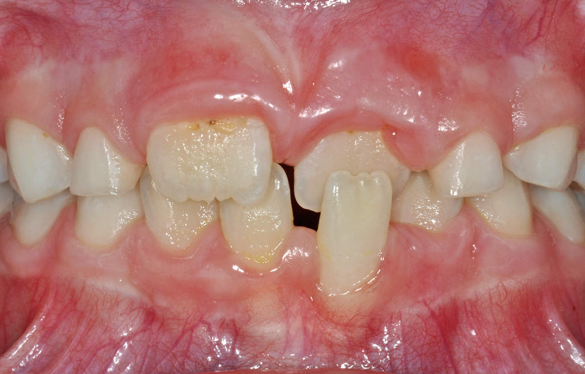 Diese Abweichung ist dadurch bedingt, dass die seitlichen Schneidezähne zu weit auf der Gaumenseite (im zahnärztlichen Vokabular: palatinal) durchgebrochen sind. Nebst der ursprünglichen Lage der Zahnkeime beim Wachstum ist sicher auch die zu knappe Platzsituation (auf dem folgenden Bild gut zu erkennen) mit daran beteiligt.