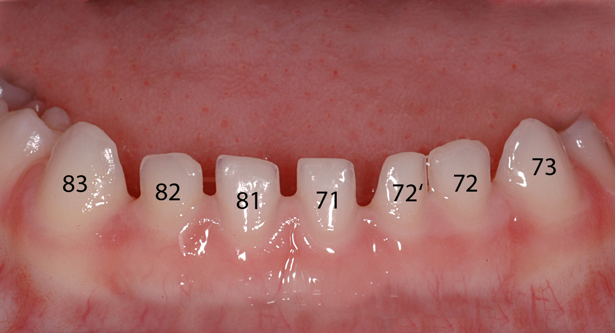 In diesem Fall eines 3-jährigen Knaben ist ein überzähliger Milchzahn in der Unterkiefer-Front zu sehen. Er ist im zweiten Bild mit 72' bezeichnet. Hierbei handelt es sich um eine Doppelanlage des seitlichen Schneidezahnes unten links.