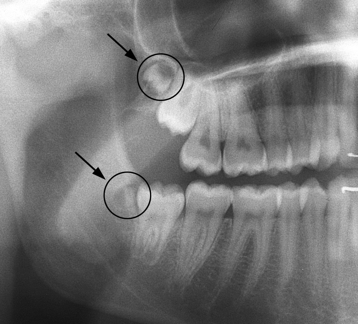 Anbei ein Fall eines 15-jährigen Mädchens, das auf der rechten Seite sogenannte «9er» hat (überzählige Zähne ganz «hinten», anschliessend an die Weisheitszähne).