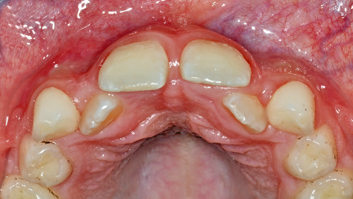 Diese Abweichung ist dadurch bedingt, dass die seitlichen Schneidezähne zu weit auf der Gaumenseite (im zahnärztlichen Vokabular: palatinal) durchgebrochen sind. Nebst der ursprünglichen Lage der Zahnkeime beim Wachstum ist sicher auch die zu knappe Platzsituation (auf dem folgenden Bild gut zu erkennen) mit daran beteiligt.
