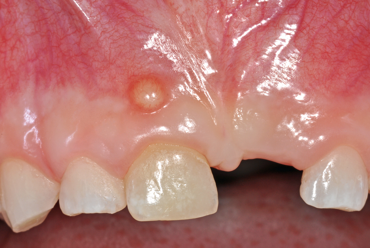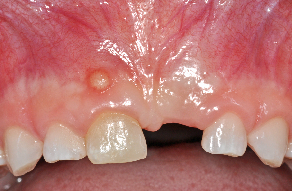 Dabei handelt es sich nach klinischer Beurteilung um einen kleinen Abszess (eine eitrige Entzündung), ausgehend vom Zahn 51. In vielen Fällen ist eine solche Entzündung bei Kindern chronisch und verläuft ohne oder mit nur sanftem Schmerz. Oft entleert sich der Eiter dieser Entzündung spontan; man spricht dann von einer Fistel.