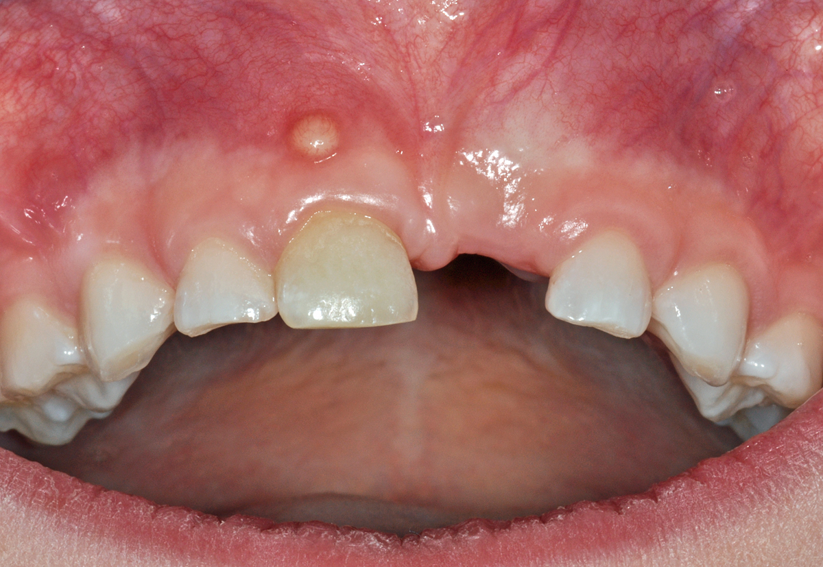 Dieser Fall zeigt einen knapp 7 Jahre alten Patienten, der sich schon vor einiger Zeit bei einem Sturz mit dem Fahrrad den mittleren Milch-Schneidezahn oben links (61) herausgeschlagen hat.