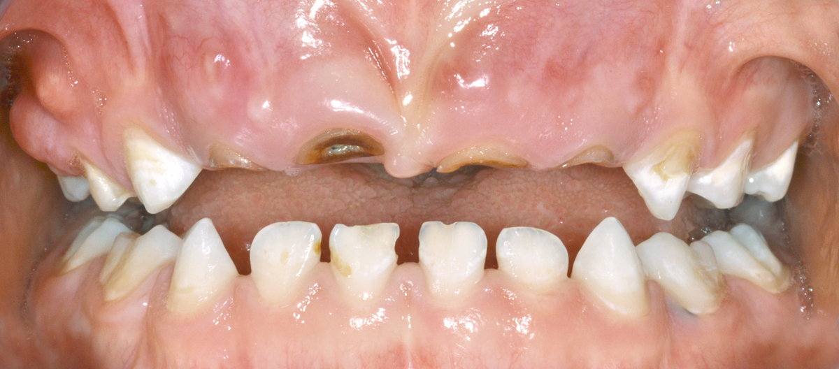 Ob nach Zahnverlust ein Lückenhalter eingesetzt wird hängt ebenfalls ganz von der Situation ab und kann so nicht allgemeingültig beantwortet werden. Ein Lückenhalter für einen Eckzahn ist, mindestens hier in Zürich, eher etwas Aussergewöhnliches, da die Frontzähne (mittlerer und seitlicher Schneidezahn) sehr viel früher wechseln als der Eckzahn und daher der Lückenhalter mehrmals angepasst werden müsste. Zudem stellt sich auch die Frage nach der Mitarbeit seitens der Patienten und ob denn überhaupt eine Lücke vorhanden wäre, die offen gehalten werden kann (oft sind leider auch die Milch-Schneidezähne so stark betroffen, dass sie entfernt werden müssen, siehe Fotos).