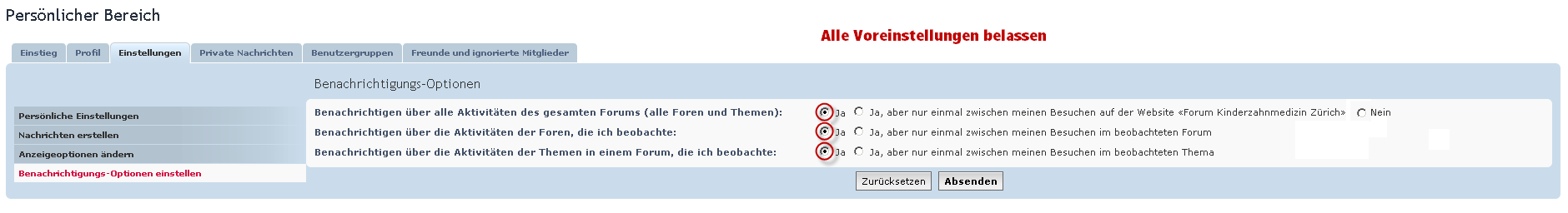 - Funktion, die eine Benachrichtigung per e-Mail bei Aktivitäten im Forum ermöglicht («Boardwatch», kann im Persönlichen Bereich unter «Einstellungen – Benachrichtigungsoptionen einstellen» angepasst werden, siehe Bild unten). Damit Benachrichtigungen nur für bestimmte Themen oder Foren versandt werden (wenn nicht über alle Aktivitäten im Forum benachrichtigt wird, OPtion 1), muss man ein Forum oder ein Thema «beobachten», d.h. unten links am Beitrag den entsprechenden Link anklicken; siehe dazu weiteres Bild unten)