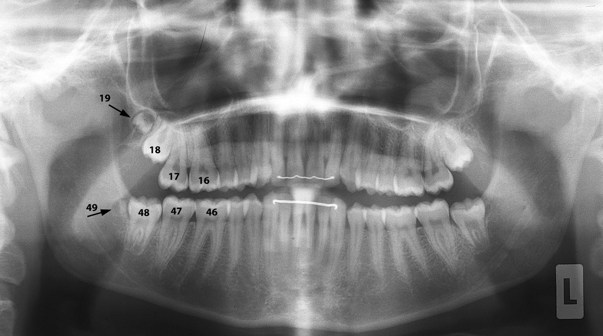 Anbei ein Fall eines 15-jährigen Mädchens, das auf der rechten Seite sogenannte «9er» hat (überzählige Zähne ganz «hinten», anschliessend an die Weisheitszähne).